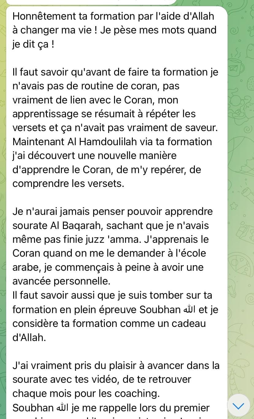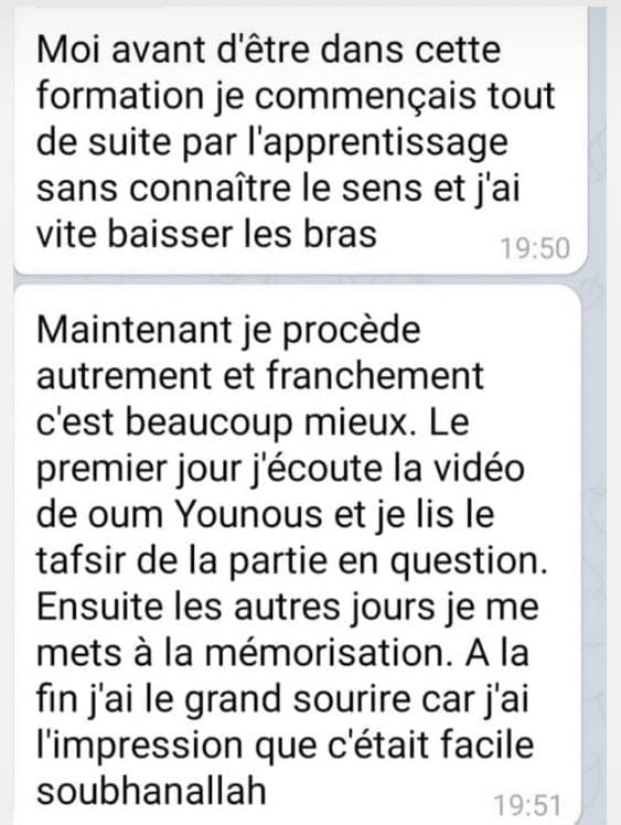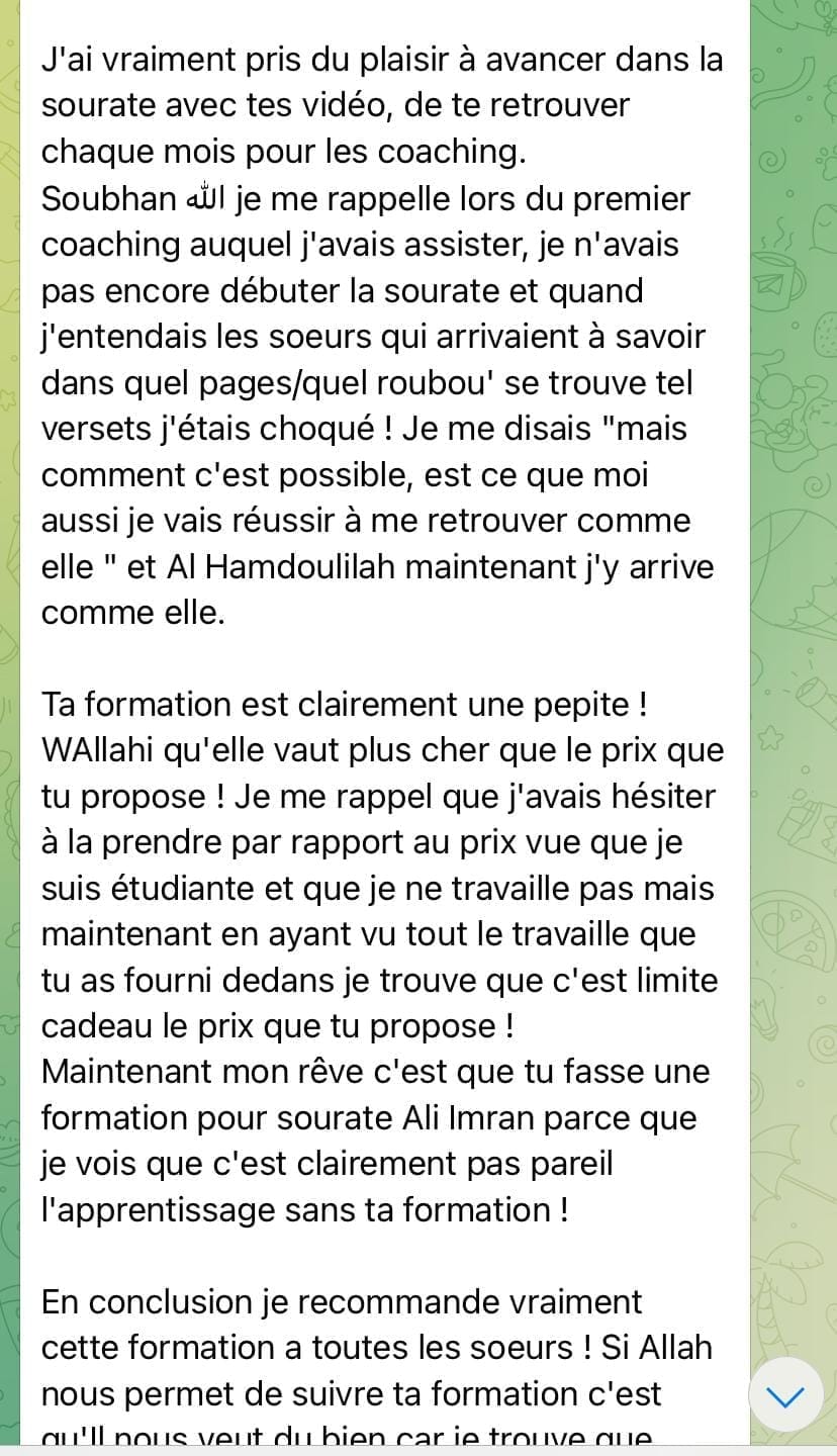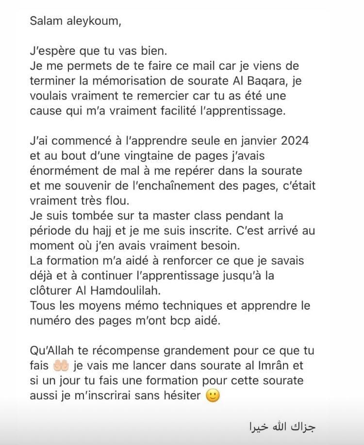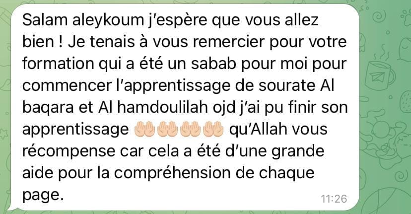 Cette formation est un accompagnement progressif qui se déroule totalement en ligne. Après avoir validé ta commande tu accéderas au module d'introduction. Puis tous les 7jours un nouveau chapitre te sera délivré. Ce temps de latence entre chaque chapitre te permettra de mémoriser la page de la sourate Al Baqarah et d'appliquer les outils délivrés.