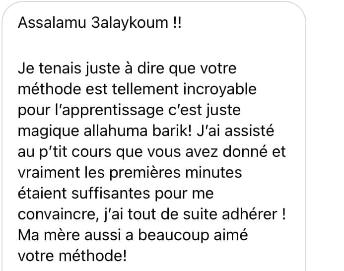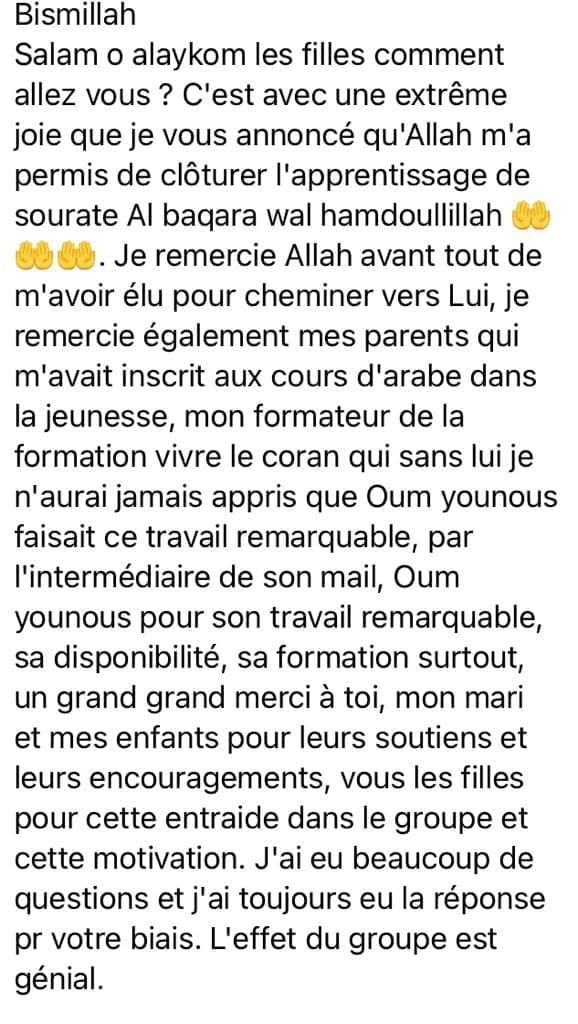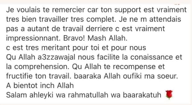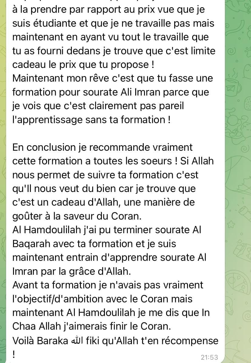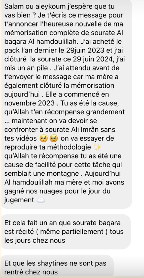 Cette formation est un accompagnement progressif qui se déroule totalement en ligne. Après avoir validé ta commande tu accéderas au module d'introduction. Puis tous les 7jours un nouveau chapitre te sera délivré. Ce temps de latence entre chaque chapitre te permettra de mémoriser la page de la sourate Al Baqarah et d'appliquer les outils délivrés.